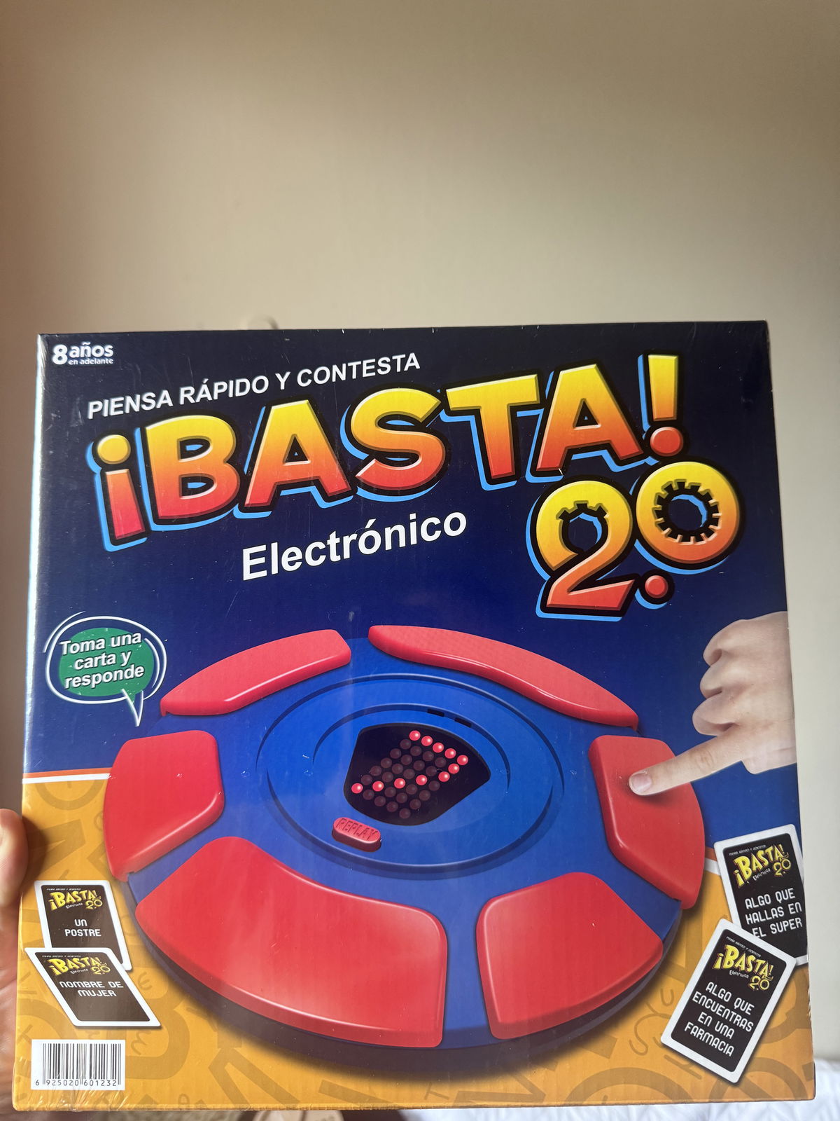 Juego electronico. Trae tarjetas donde dice que nombres algo ejemplo "cosas que encuentras en una granja" y en el aparatito te salta la letra con la que tenes que responder y corre el tiempo.