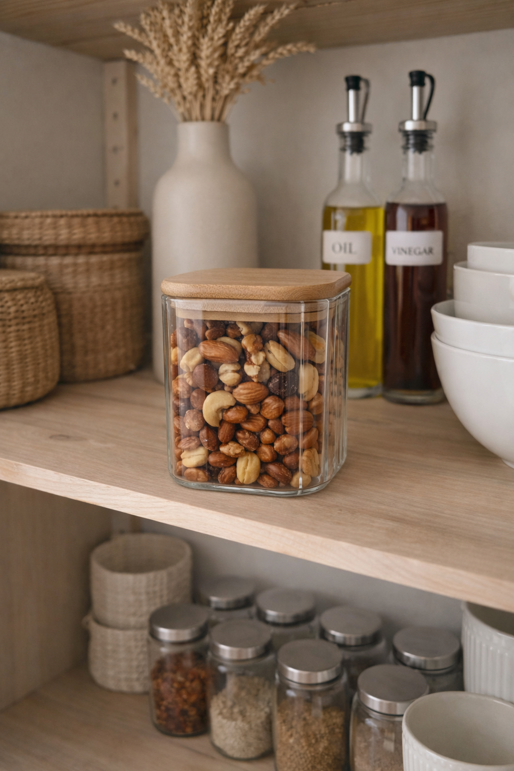 Frasco de vidrio con tapa de bambú